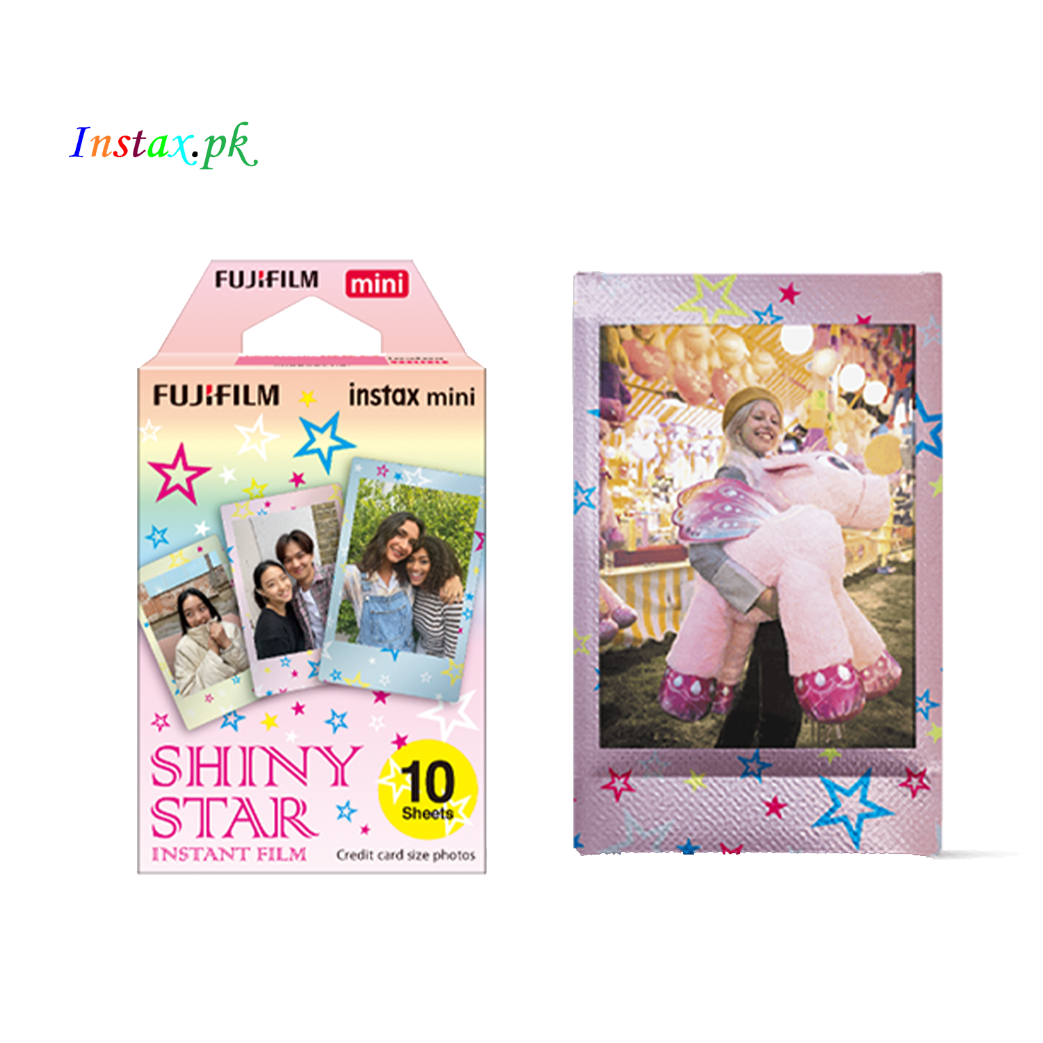 The Instax Mini Shiny Star Instant Film brings a magical and celestial touch to your Fujifilm Instax Mini camera. This dazzling film features shiny star designs, adding a sparkly and whimsical feel to your instant photos.
